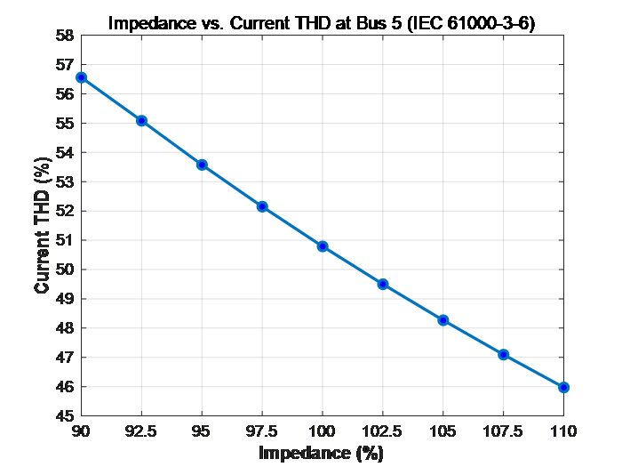 90%일 때 5번 모선의 전류 THD는 56.6682%이며, 임피던스가 110%일 때는 45.9736%로 나타났다. 이는 선로 임피던스가 증가할수록