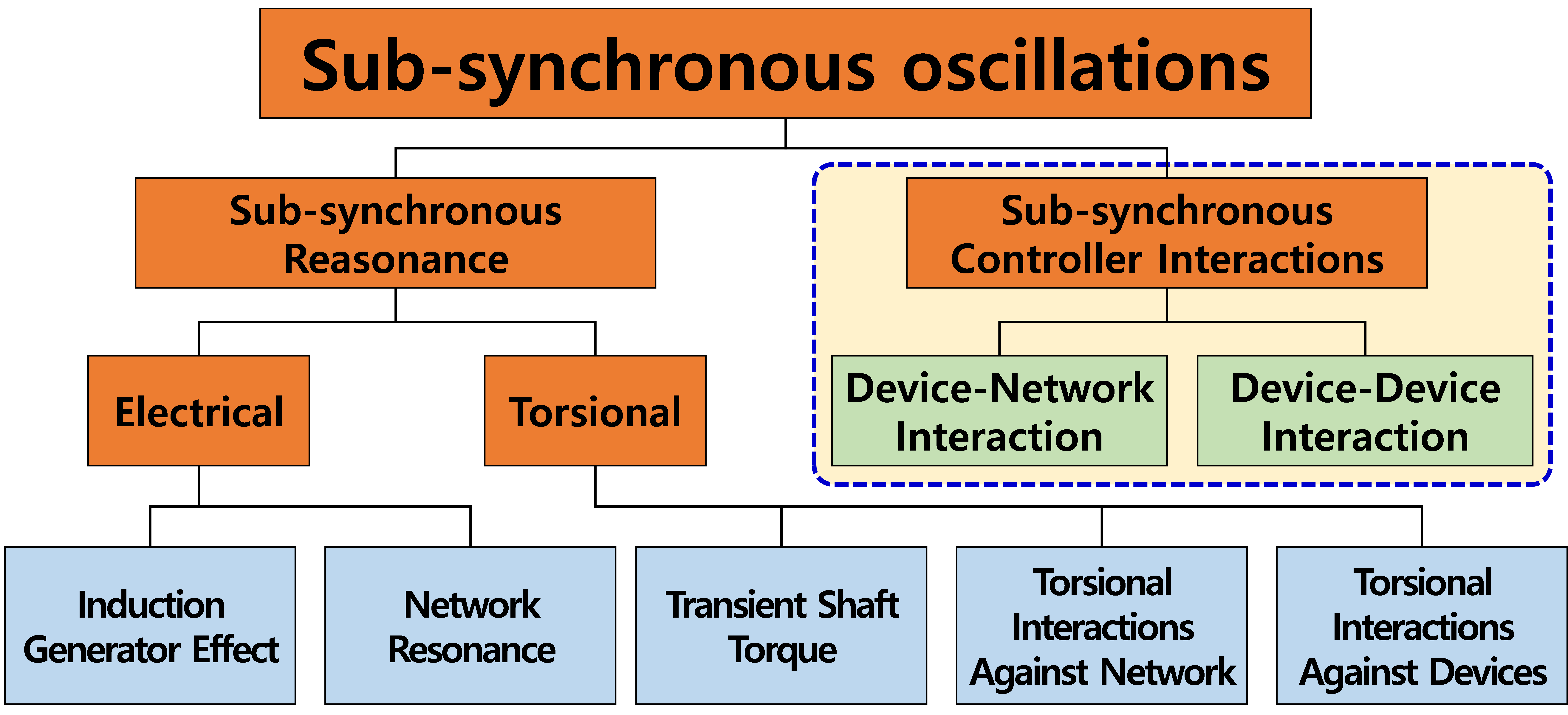 진동 사례들이 보고되고 있다. 그림 1은 SSO 분류 체계로 좌측은 동기발전기에 주로 발생하는 SSR에 대한 범주이며, 우측은 최근 전력전자 기반 SSCI (Sub Synchronous