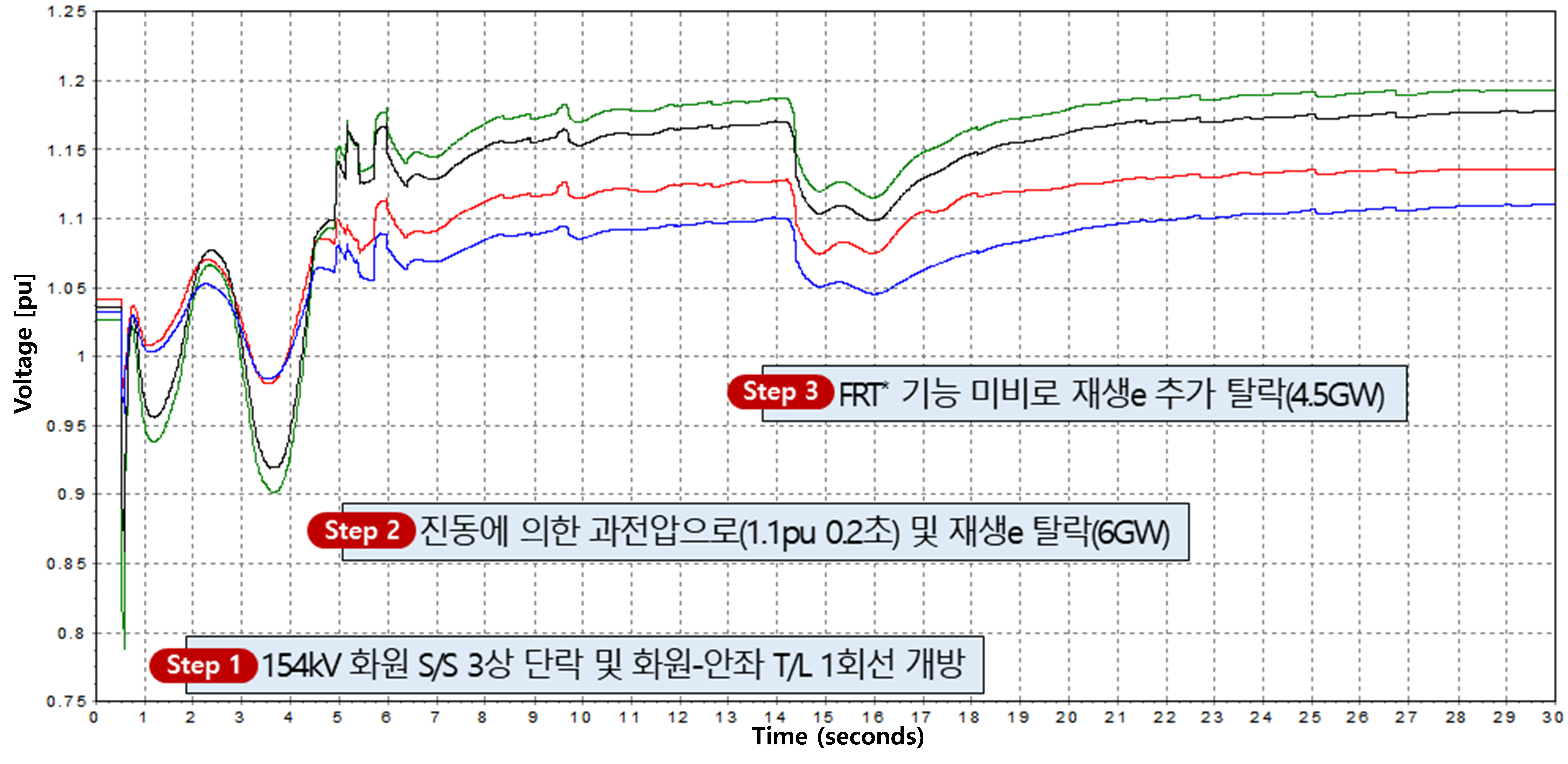 시에도 200 ms 동안 연계가 유지되어야 함을 의미한다. 기존에는 0.5 pu 미만으로 전압이 낮아지면 설비 보호 등을 위해 즉시 탈락시켰으나 재생에너지가
