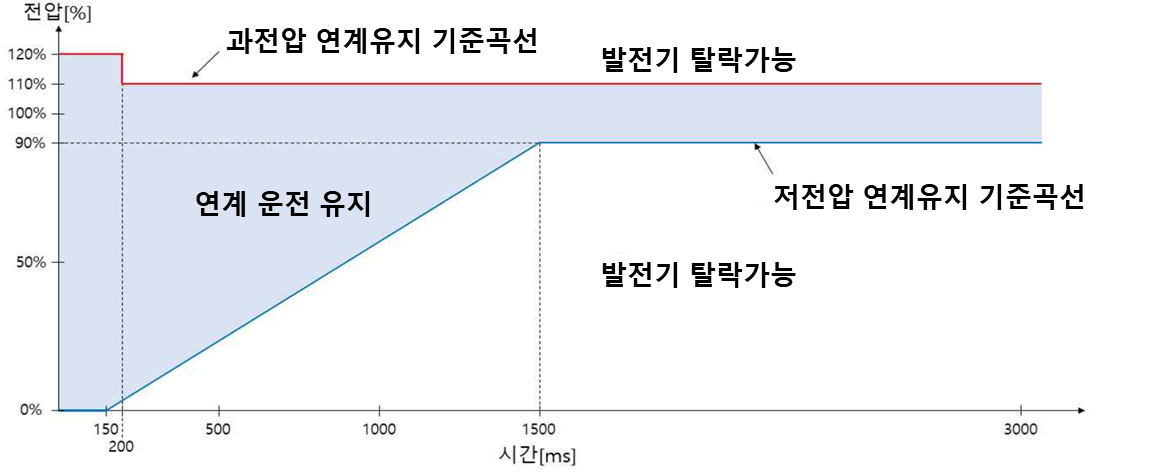 그림 3은 전압 변동 시 연계 유지기능 범위를 정의하고 있으며, 전압이 0이 되어도 계통과 즉시 분리하지 않고 150 ms 연계 유지, 1.1 pu 초과