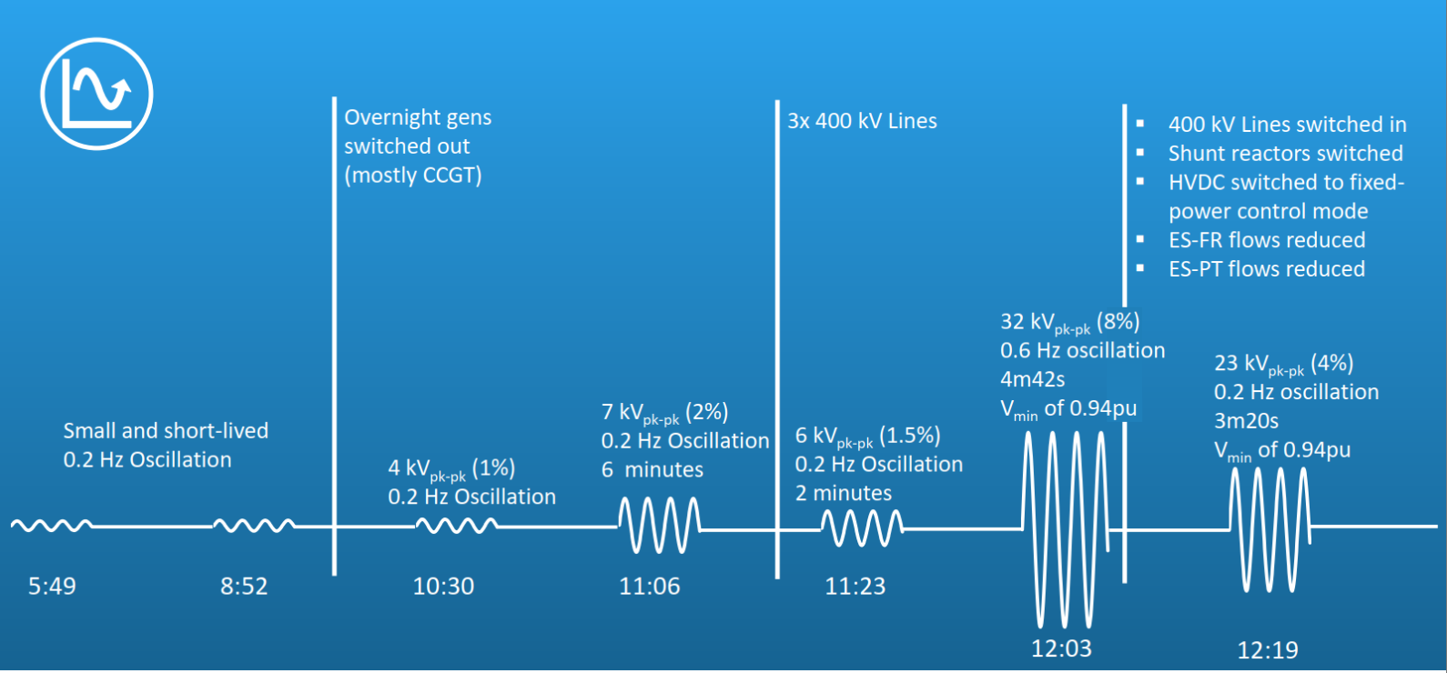 스페인 전력망 진동 발생 현상과 제어 조치들이 대정전으로 이어진 상황에 대해 간략하게 설명한다. 4장 사례연구에서는 실효치 및 순시치 기반의 계통