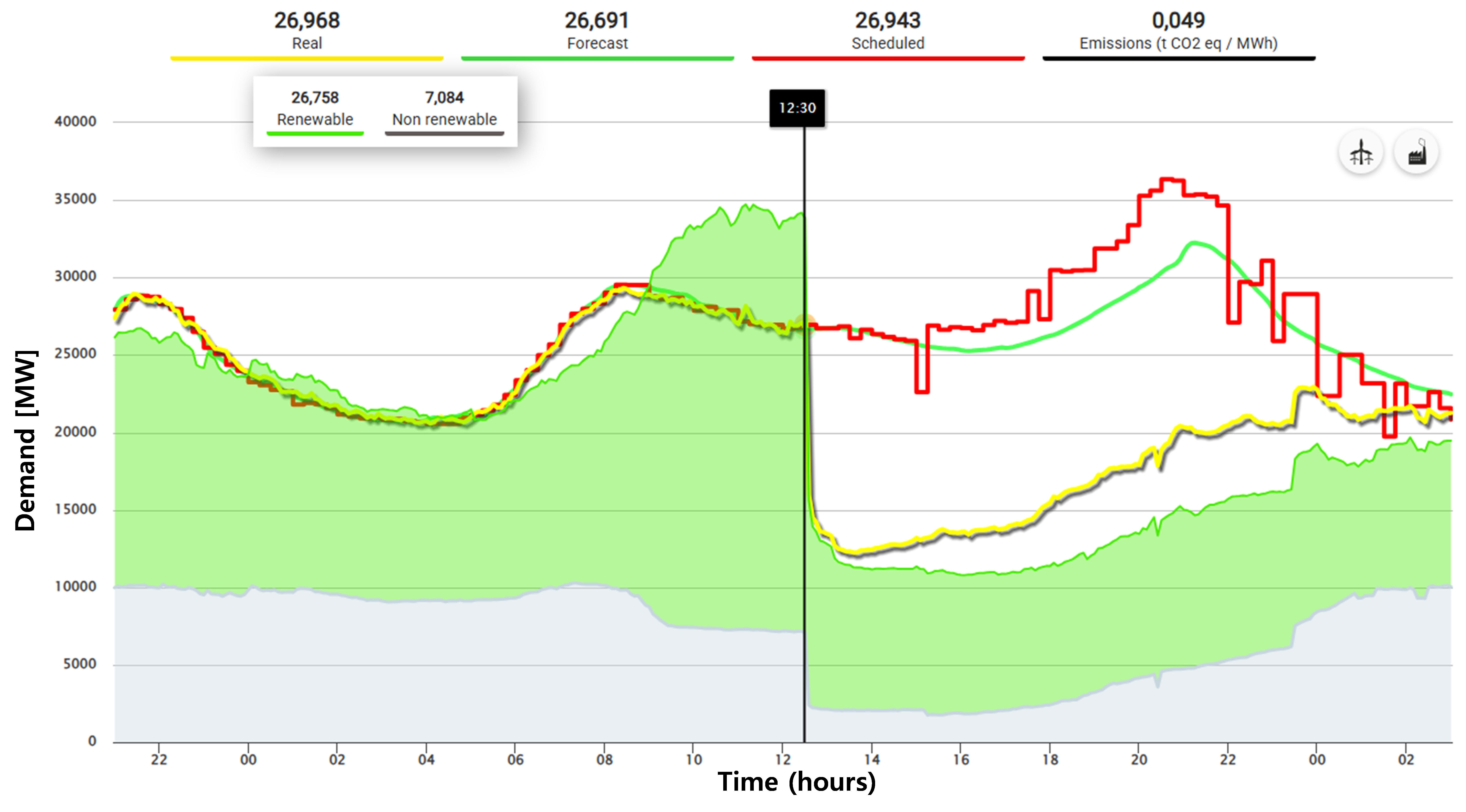 직전인 12시 30분에 기록된 스페인 총 발전량은 32,466 MW로 매우 적었고, 재생에너지가 72.7 % 수준이었다. 이러한 상황들을 토대로 스페인