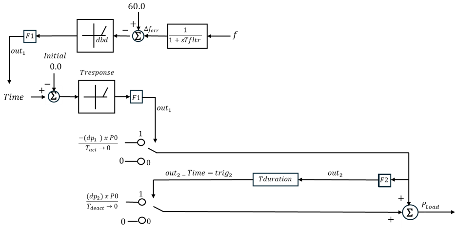 이에 본 연구에서는 전력망 안정화 효과를 분석하기 위해, 특정 주파수 이탈과 지속 시간에 따라 동작이 트리거되는 동적 부하 모델을 개발하였다. 그림 2의 블록 다이어그램에 나타난 바와 같이, 계통 주파수가 기준값에서 설정된 시간 이상 벗어날 경우 Time delay를 거쳐 동적으로 반응하는 Frequency–Time