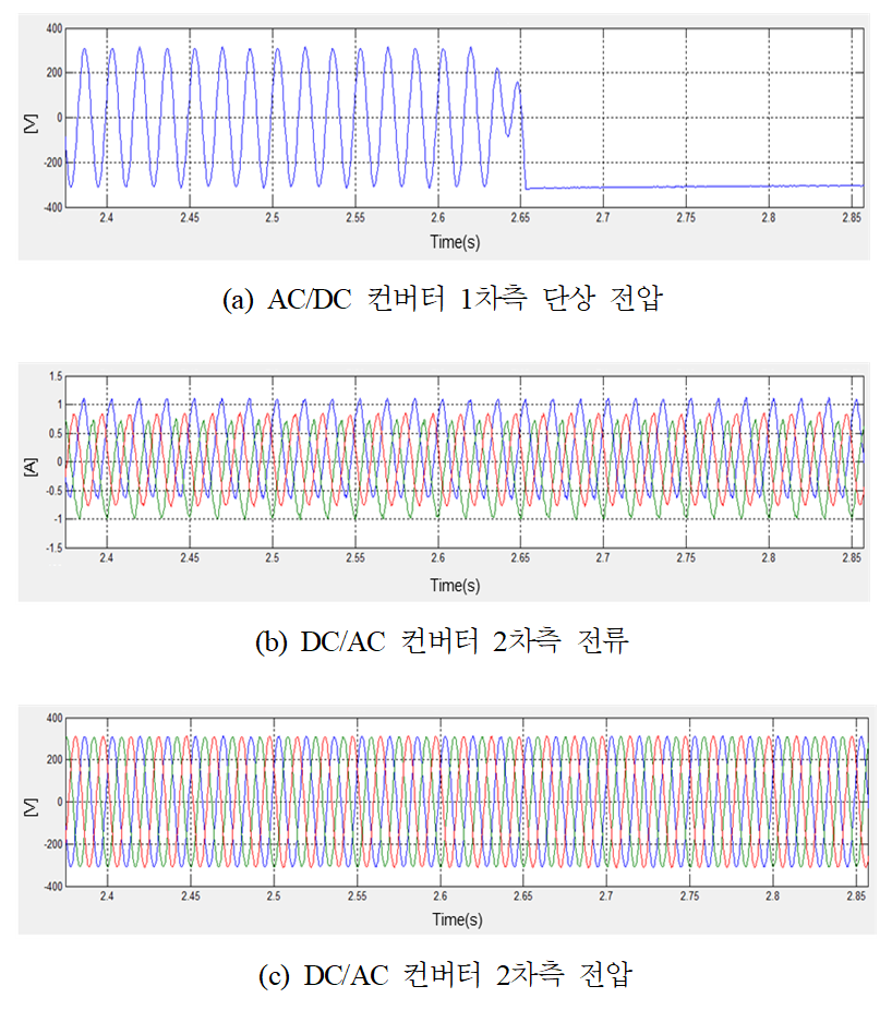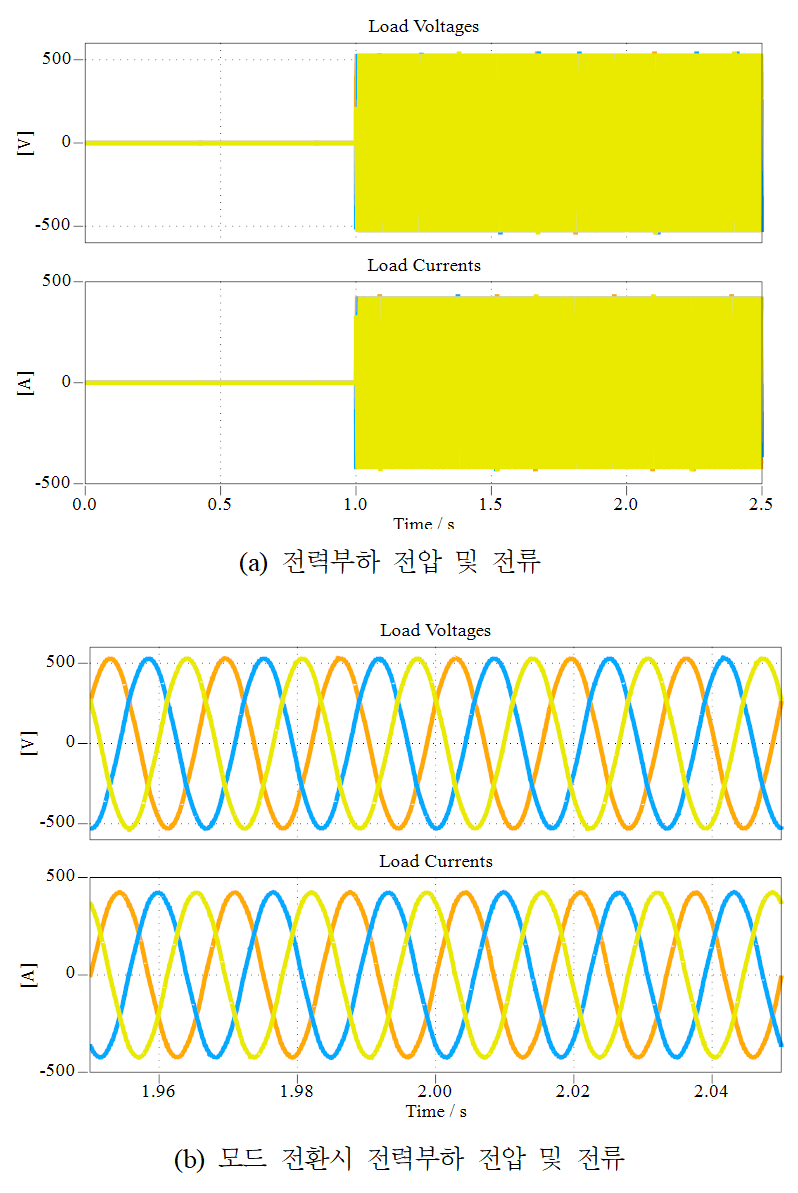 또한, 계통 탈락 시에는 계통 측 릴레이를 개방함과 동시에 AC/DC 컨버터의 게이팅 신호를 차단하여 UPS 운전 모드의 전환을 구현하였다.
