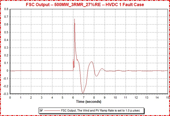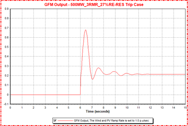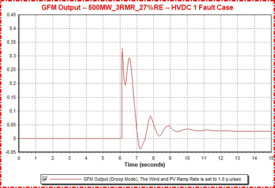 앞선 HVDC 고장에 대한 두 설비의 유효전력 출력은 FW-SC와 GFM의 유효전력 출력을 비교하면, GFM은 전력계통 내 순간적인 유효전력 응답이