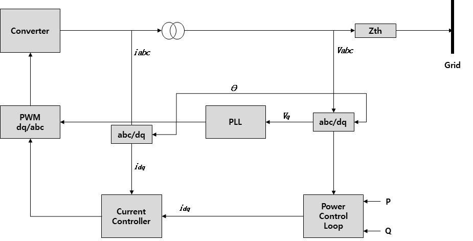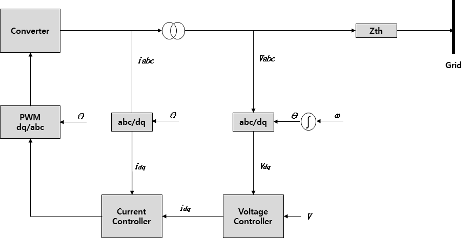 파악하기 위하여 PLL을 통해 위상각을 취득하고 이를 abc-DQ 변환에 사용한다. 이후 동기화된 계통 전압을 기준으로 전류를 제어해 상위제어기의