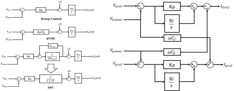 전압전류제어로 구성되어있다. 위상각 제어(Active Power Control, 이하 APC)는 Droop, dVOC, VSM 이 포함되어 있다.