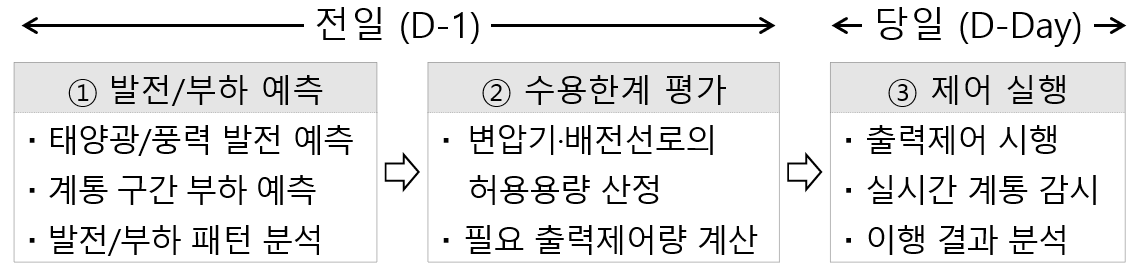 필요한 출력제어량을 산정한다. 운전 당일(D-day)에는 계획에 따라 발전출력을 제한·조정하고, 실시간 모니터링으로 계획 대비 실행 결과를 검증한다.