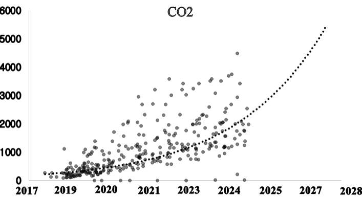 변압기의 경우 CO 400 ppm 이상 및 CO₂ 2,500 ppm 이상시 요주의, CO 800 ppm 이상 및 CO₂ 5,000 ppm 이상시 변압기는