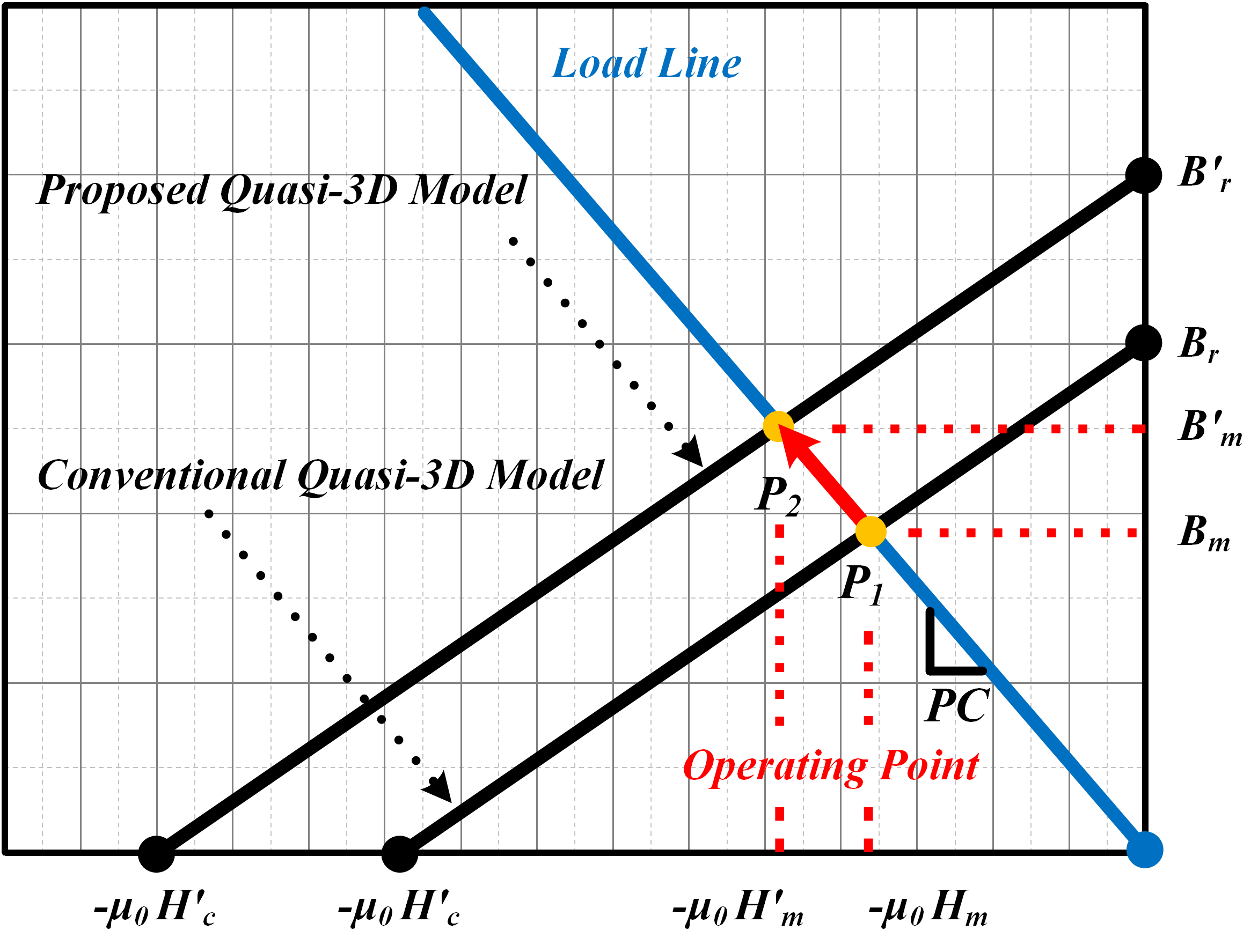 따라서 본 연구에서는 Quasi-3D 해석 기법을 기반으로, AFPM의 PM 오버행 구조를 고려한 동작점 변환 기법을 제안하며, 이를 통해 해석 결과와