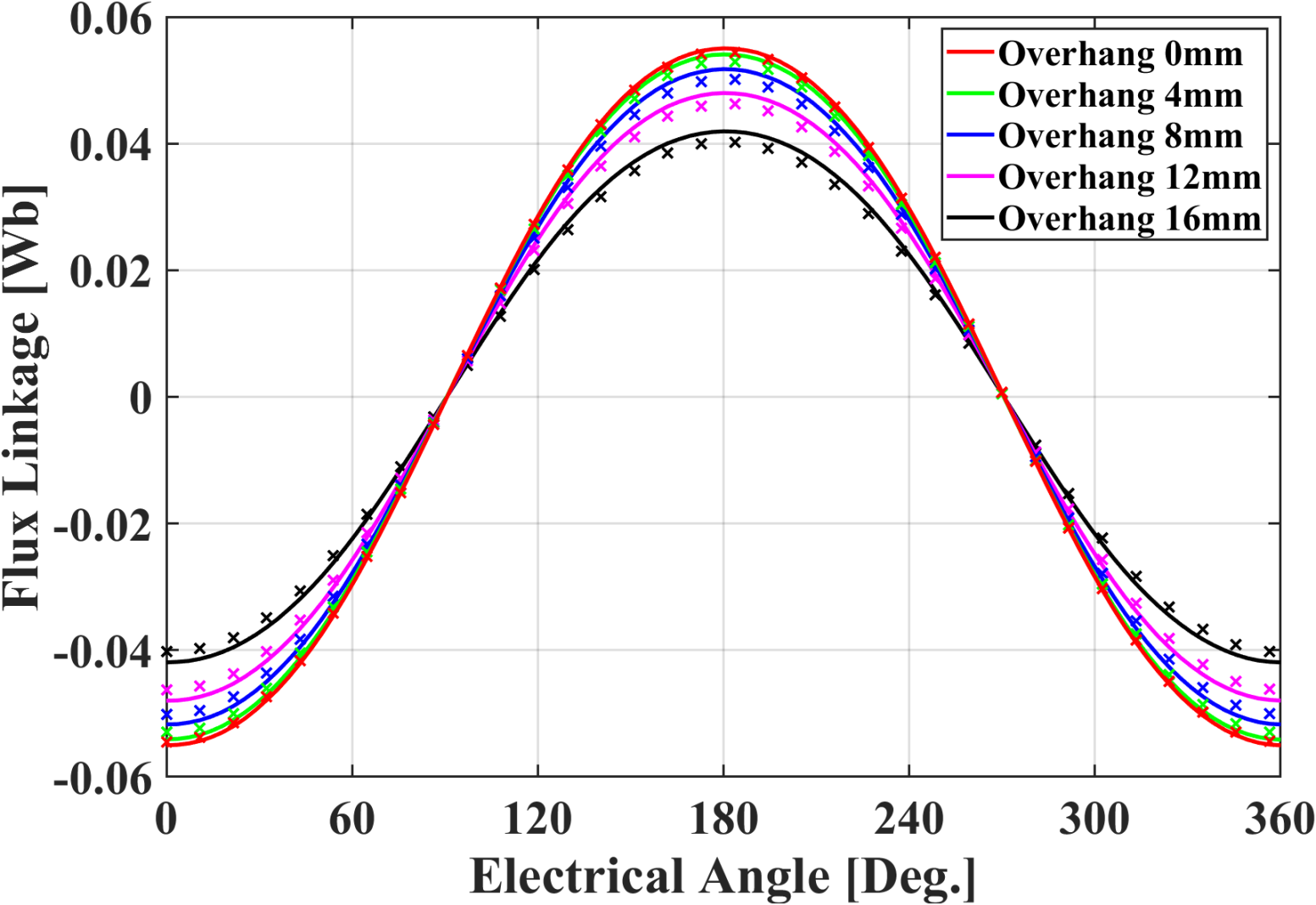 영구자석(Permanent Magnet, PM) 오버행 구조가 적용될 경우, 돌출된 PM에 의해 추가적인 자속이 발생하여 자속 분포 및 자기장 특성에