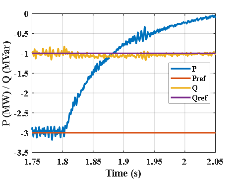 DC 고장 발생 이후 DC 측과의 분리로 인해 유효전력 전달은 끊어지지만, AC 측의 무효전력 제어 기능은 유지된다. 그림 11에 FBMMC #3의 고장 전후의 유효전력/무효전력 지령값과 측정값을 나타내었다.