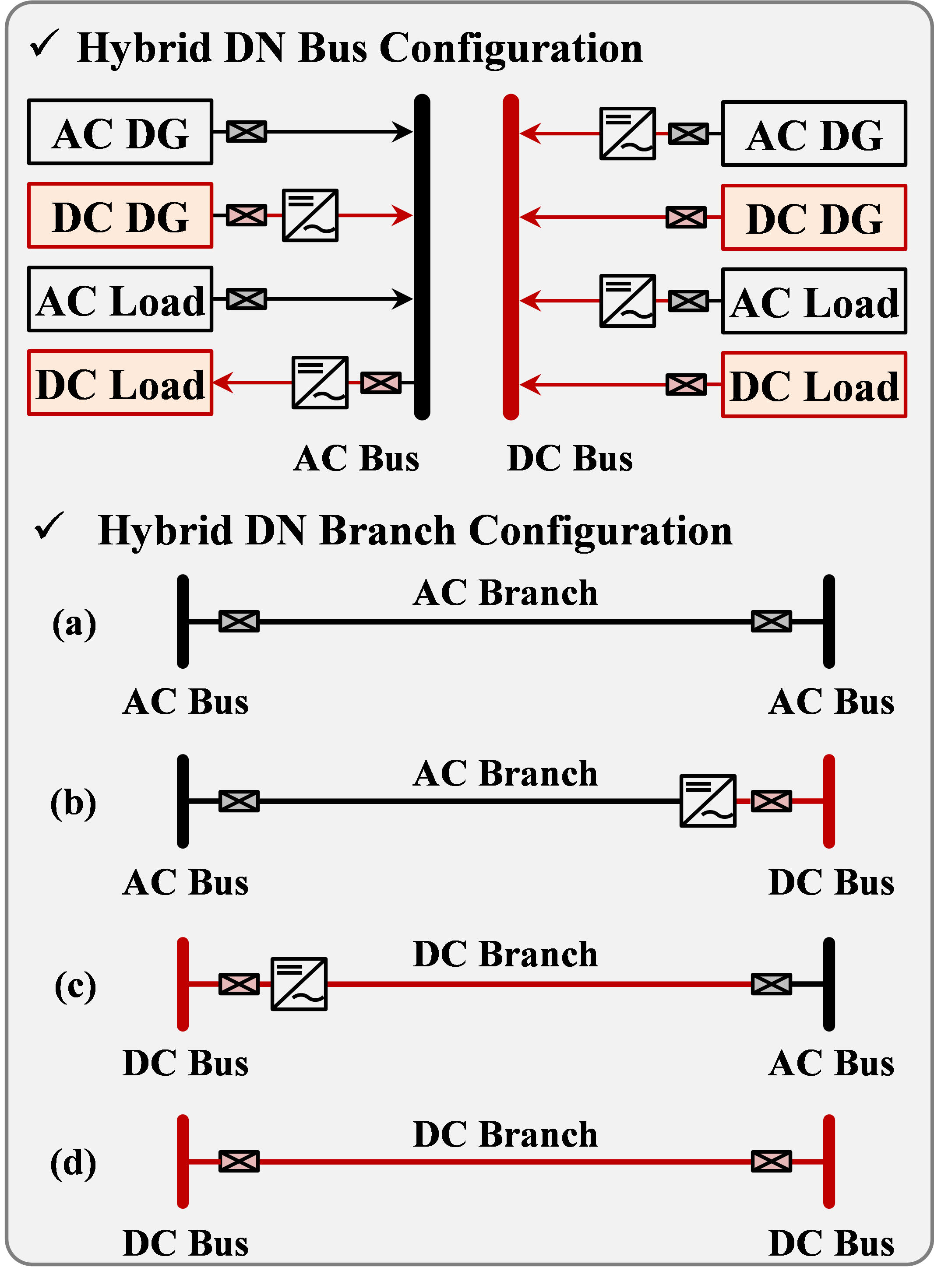 AC/DC 하이브리드 배전망에서, (c) 구성은 (b) 구성과 반대인 버스 구성을 가지고, AC 선로 대신 DC 선로를 채택한 케이스이다. 따라서