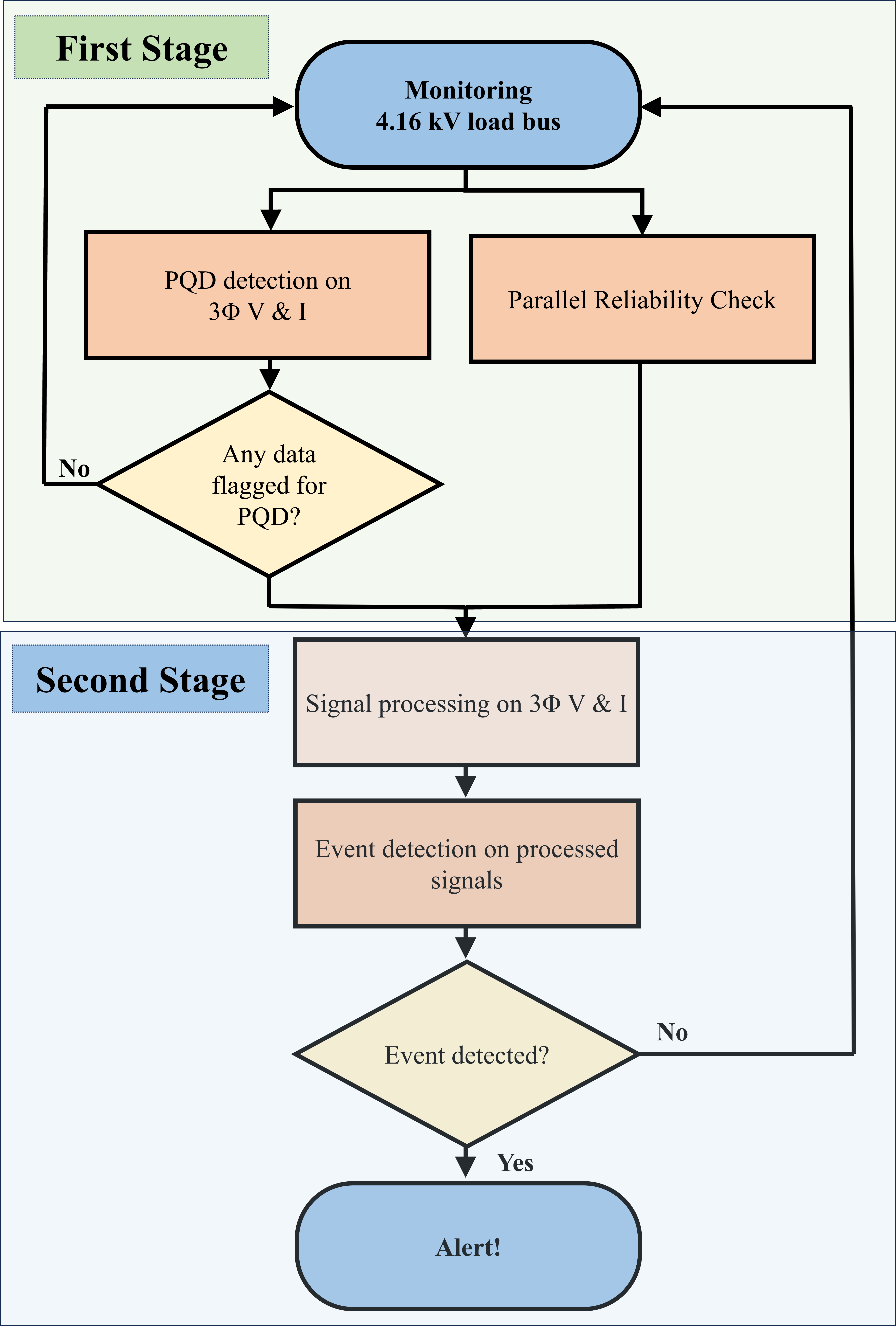 전류, 또는 주파수의 변동으로 정의되는 이러한 현상은 비정상 운전 상태의 지표로 활용될 수 있다. 그림 1의 순서도에 제시된 바와 같이, 본 논문에서는 계산 효율성이 높게 이벤트를 감지하기 위해 2단계의 계층적 프레임워크를 제안한다. 1단계에서는 4.16kV