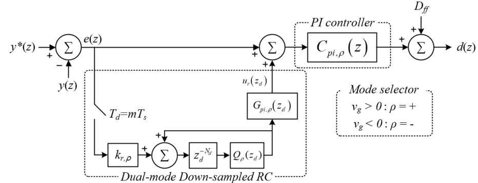 이러한 한계를 극복하기 위해 다운 샘플링된 반복학습제어기(Down-sampled repetitive controller, DRC)가 제안되었다[4]. 기존 샘플링 주파수에 구현되는 PI제어기와 달리 DRC는 다운샘플링 주파수에서 구현되기에 연산 부담이 줄어들 뿐만 아니라 계통 주기 내에서 요구되는