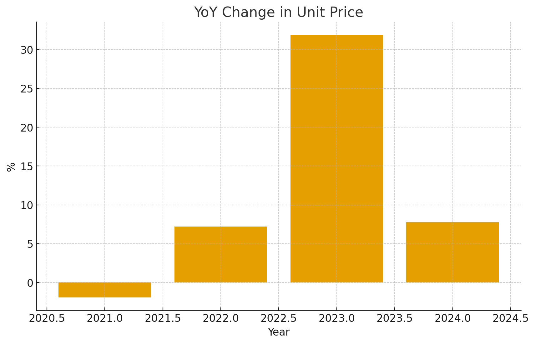 반등하였다. 그러나 전력 요금의 상승 폭은 더 가팔라 2023년에 전년 대비 +102.6%를 보였고, 2024년에도 +13.5% 추가 상승하였다.