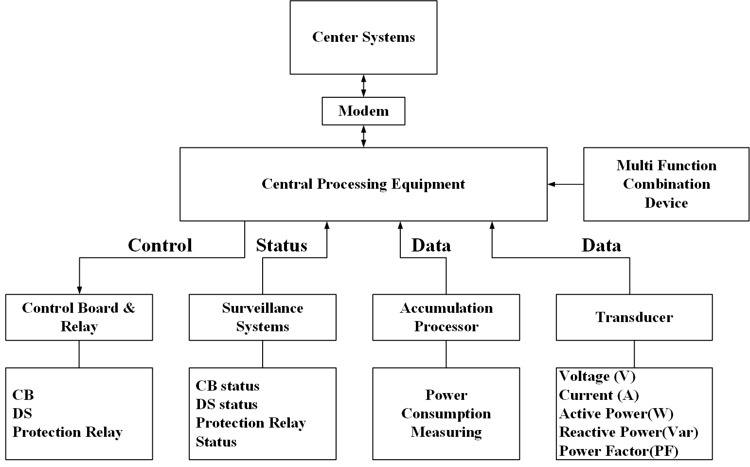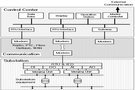 Fig.1은 변전소용 SCADA 시스템을 나타낸 것이다. 다양한 입·출력 장치는 변전소를 구성하는 스위치, 차단기, 커패시터, 배터리, 전류·전압