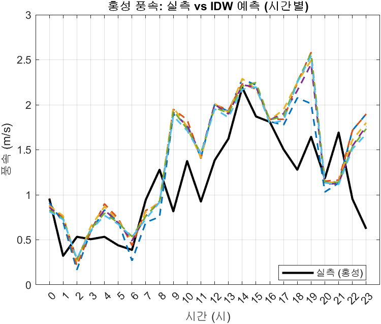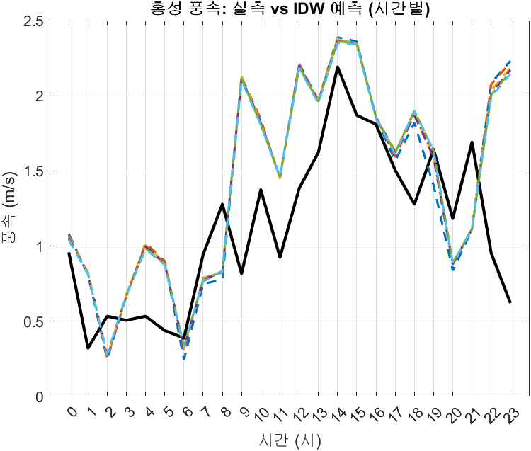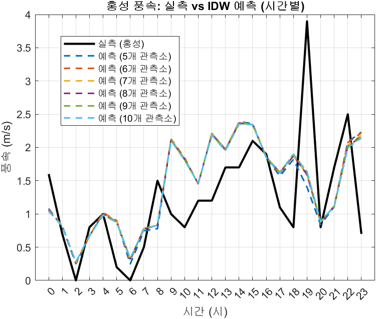 km ๋ฏธ๋ง์ ์์นํ ๊ธฐ์๊ด์ธก์์ ์ธก์ ์ ๋ณด์ ํ์ฉ, ์ด ๊ฐ๋ค์ ๊ฐ๊ณต ์ก์ ์ ๋ก ์์น๋ก ๋ณด์ ํ๊ธฐ ์ํด ์ญ๊ฑฐ๋ฆฌ๊ฐ์ค๋ฒ (IDW, Inverse Distance