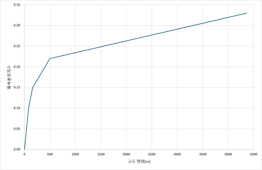 ํ์์ ๋ํด์๋ ๊ณ ๋ ๋ณํ์ ๋ฐ๋ฅธ ํ์์ ์ง์ ๊ด๊ณ๋ฅผ ์ด์ฉํ ๋ฌผ๋ฆฌ์ ๋ณด์ ๊ณผ์ ์ผ๋ก Power Law๋ฅผ ์ ์ฉํ์๋๋ฐ, ์ด ์ (4)๋ ๊ณ ๋์ ๋ฐ๋ฅธ ๊ณต๊ธฐ๋ฐ๋ ๊ฐ์๋ก ํ์์ด ๋ณํํ๋ ๊ฒ์ ์ํ์ ์ผ๋ก ํํํ Deacon์์ ๊ธฐ๋ฐ์ผ๋ก ํ๊ณ ์๋ค [12].