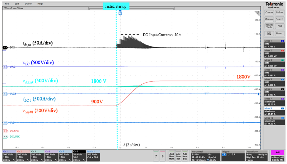 충전을 위한 초기 구동 시퀀스의 동작을 확인하였다. 그림에서 볼 수 있듯, 초기 구동 전, TP의 입력전압 vdclink는 1800V를 유지한다.