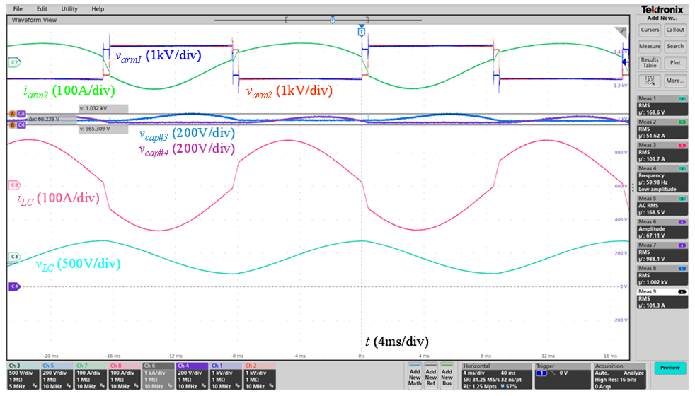 그림 12는 SM 시험평가 시스템의 초기 구동 시험 결과를 보여준다. 앞선 절에서 언급했듯이, MC의 공진 전류 제어 시, SM은 50%의 duty cycle로
