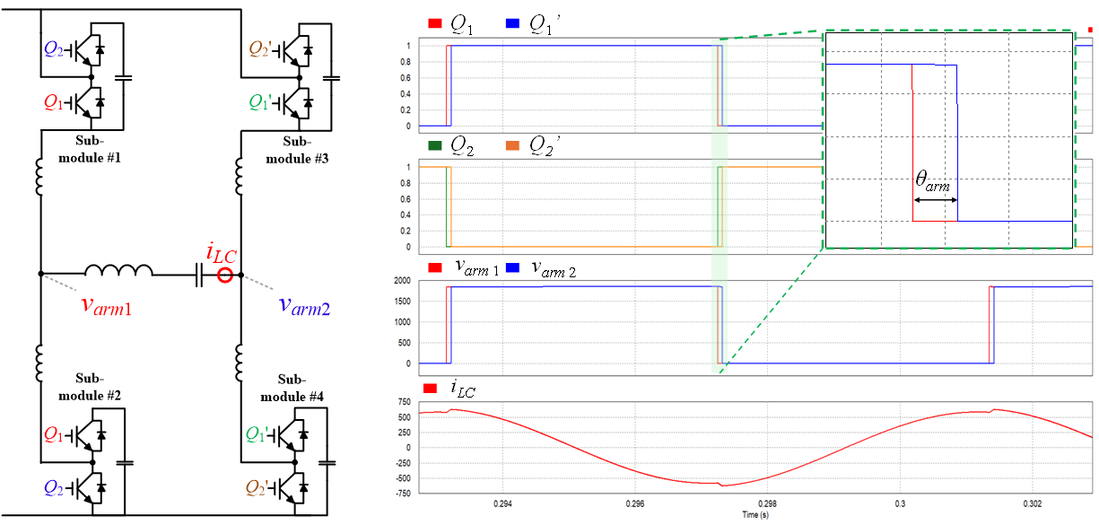 내 SM의 위상을 제어한다. 그림 13에서 볼 수 있듯, 각 arm의 출력 전압은 위상차를 갖게 되며 이로 인해 공진전류가 흐르게 됨을 확인할 수 있다.