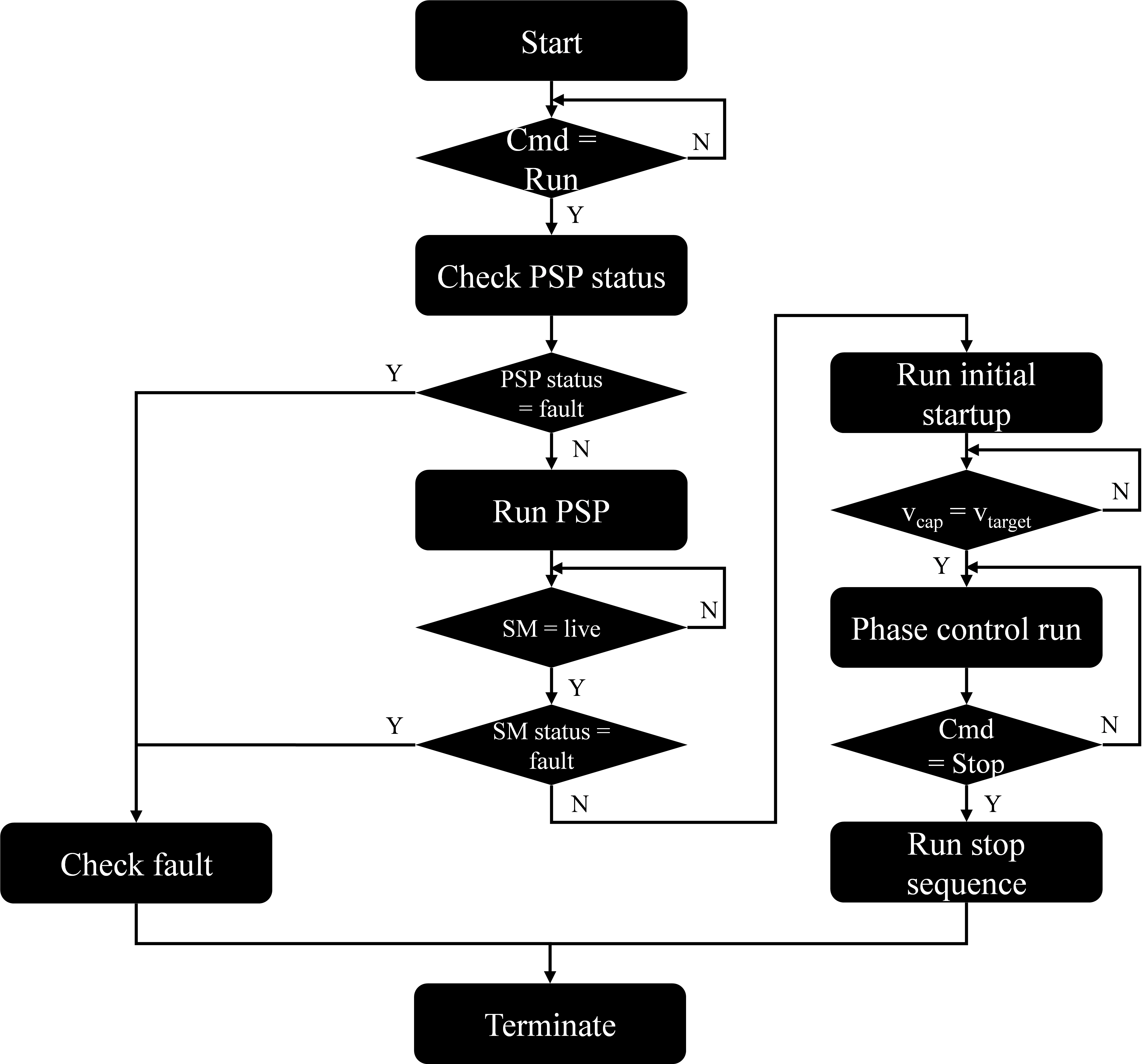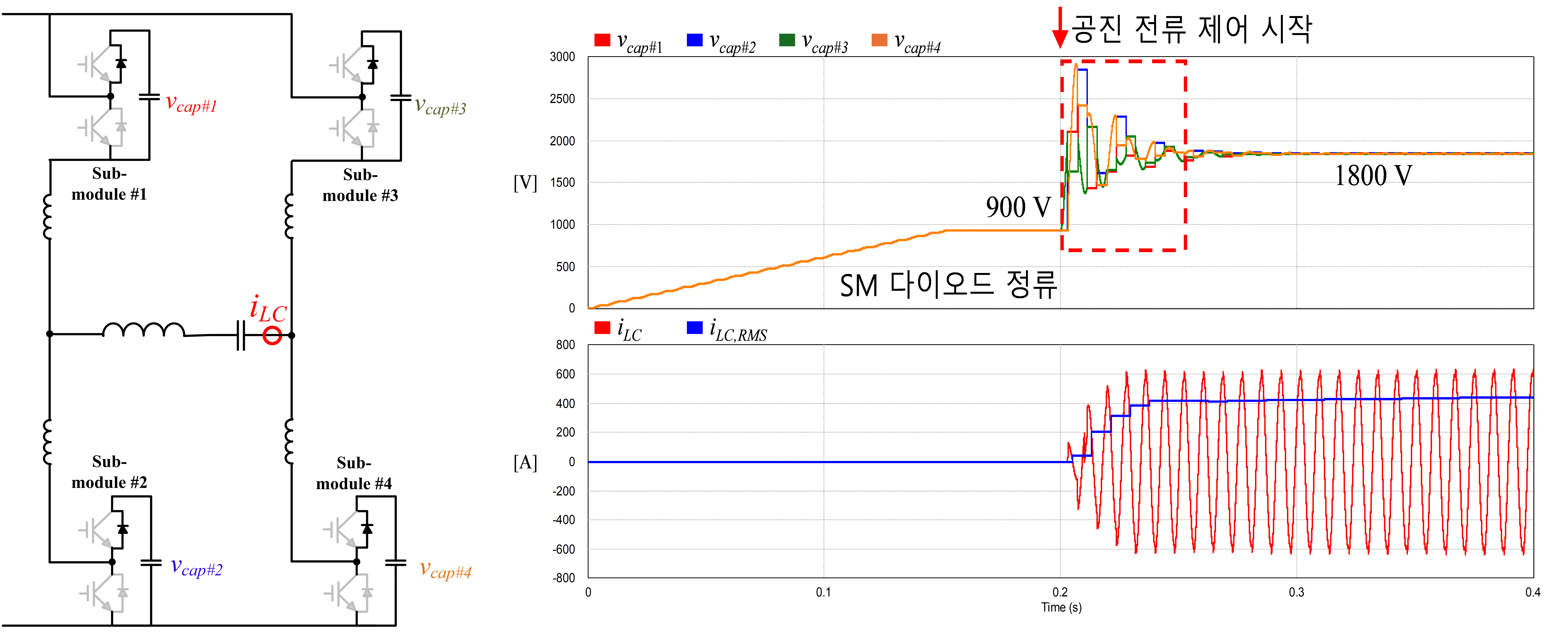직류 전압을 공급받게 되고, TP를 구성하는 SM은 내부 다이오드 정류 동작을 통해 900V까지 충전된다. 이 상태에서 MC의 공진 전류 제어를 수행하는