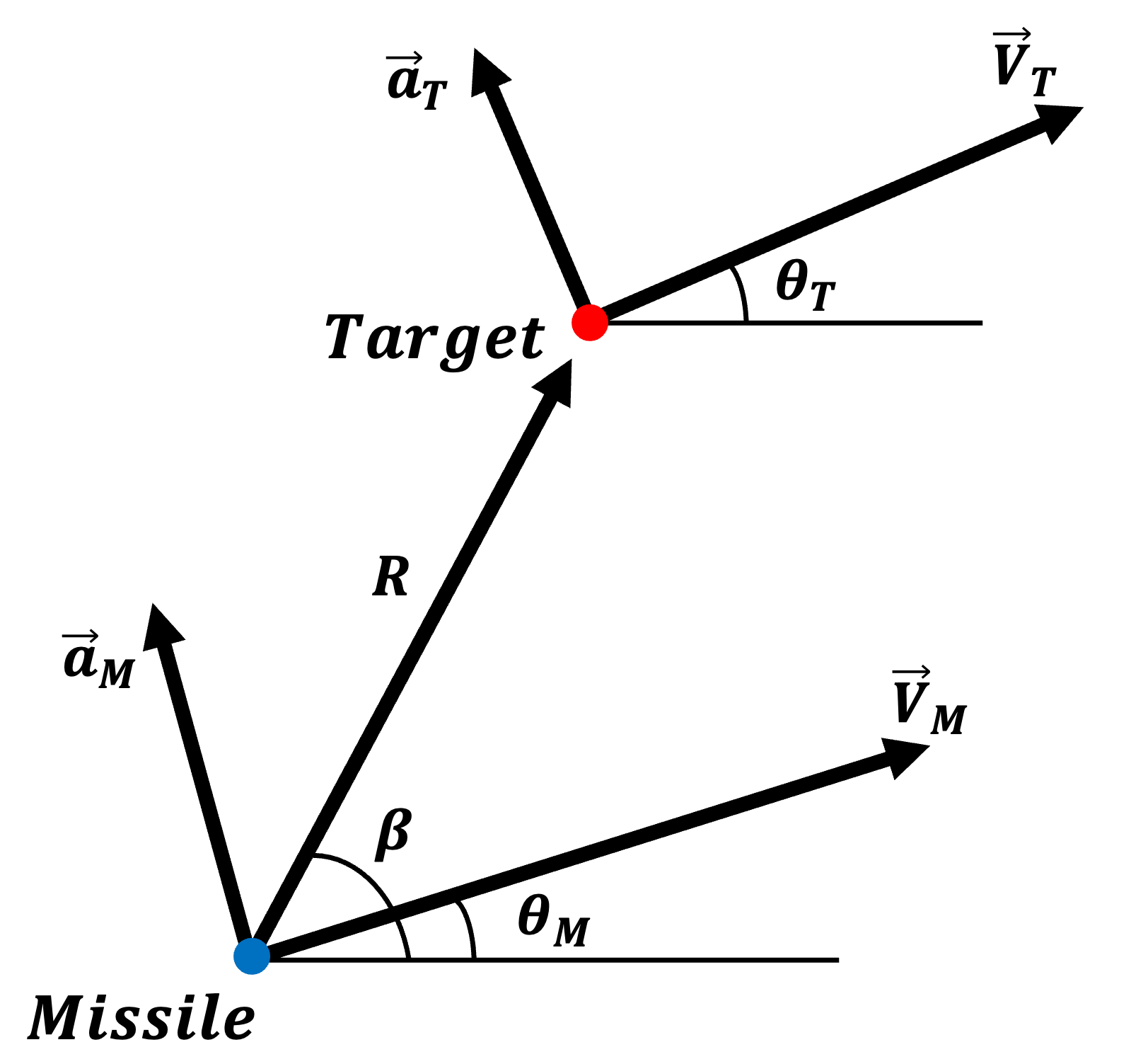 이용하여 방향을 변경한다. 목표물은 시간에 따라 속도를 변경할 수 있으며, 미사일은 목표물의 입력인 방향 제어 가속도를 알 수 없다. 또한 미사일과
