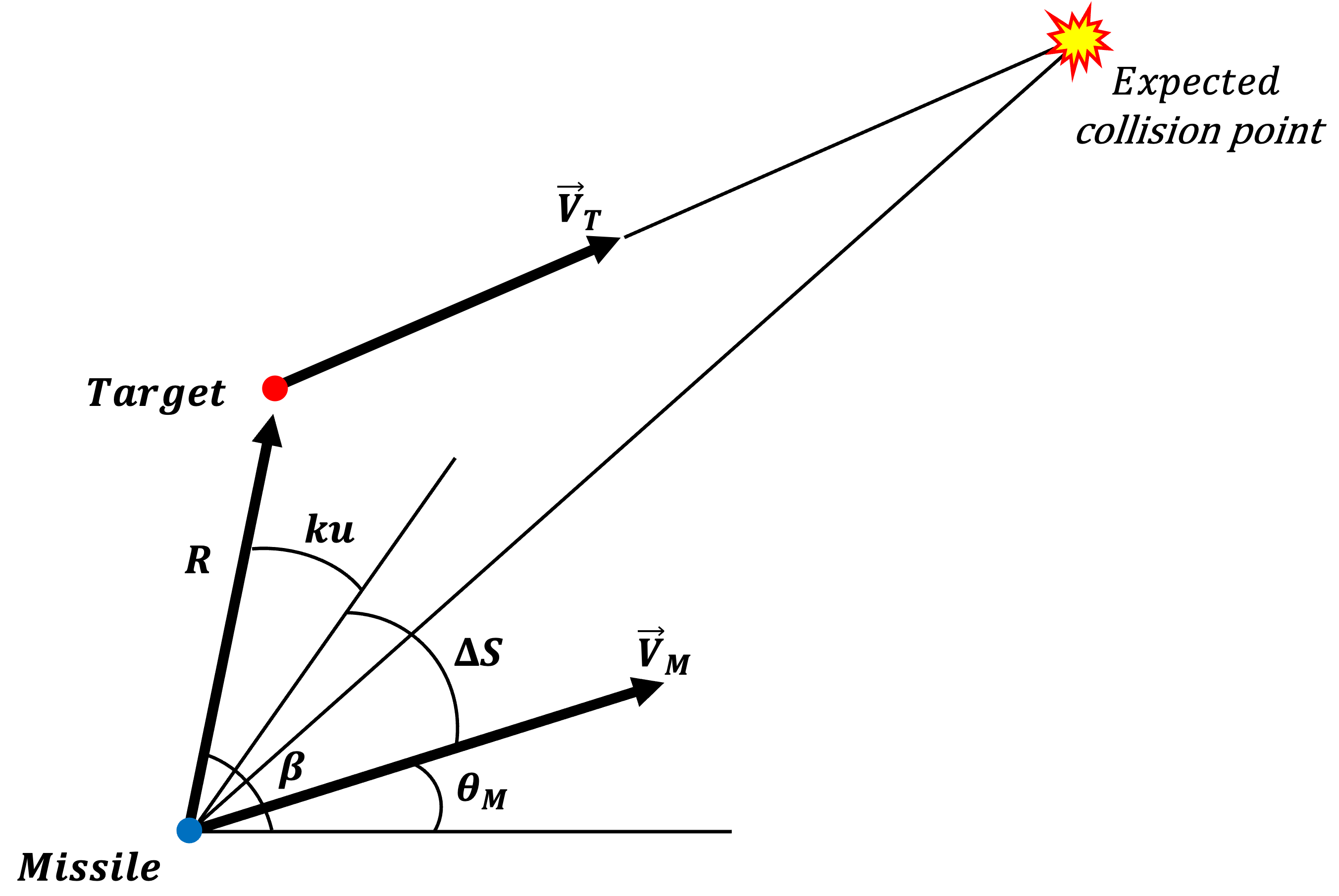 유도 법칙을 설계한다. 이를 위해, 해양 항법에서 유래한 충돌 삼각형(collision triangle) 개념을 활용하여 목표물과 미사일, 예상 충돌
