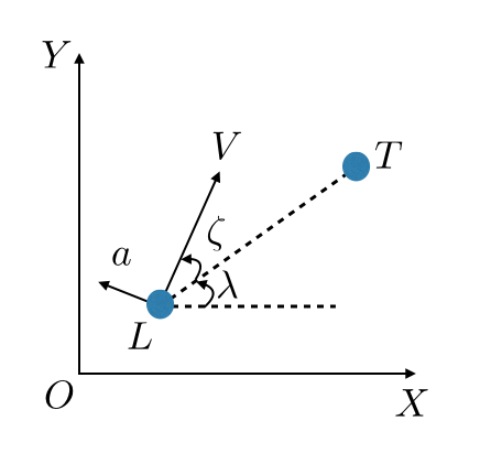 그림에서 $L$은 무인비행체, $T$는 움직이지 않는 표적, $\lambda$는 무인비행체와 표적과의 시선각, $\zeta$는 표적과의 시선각에