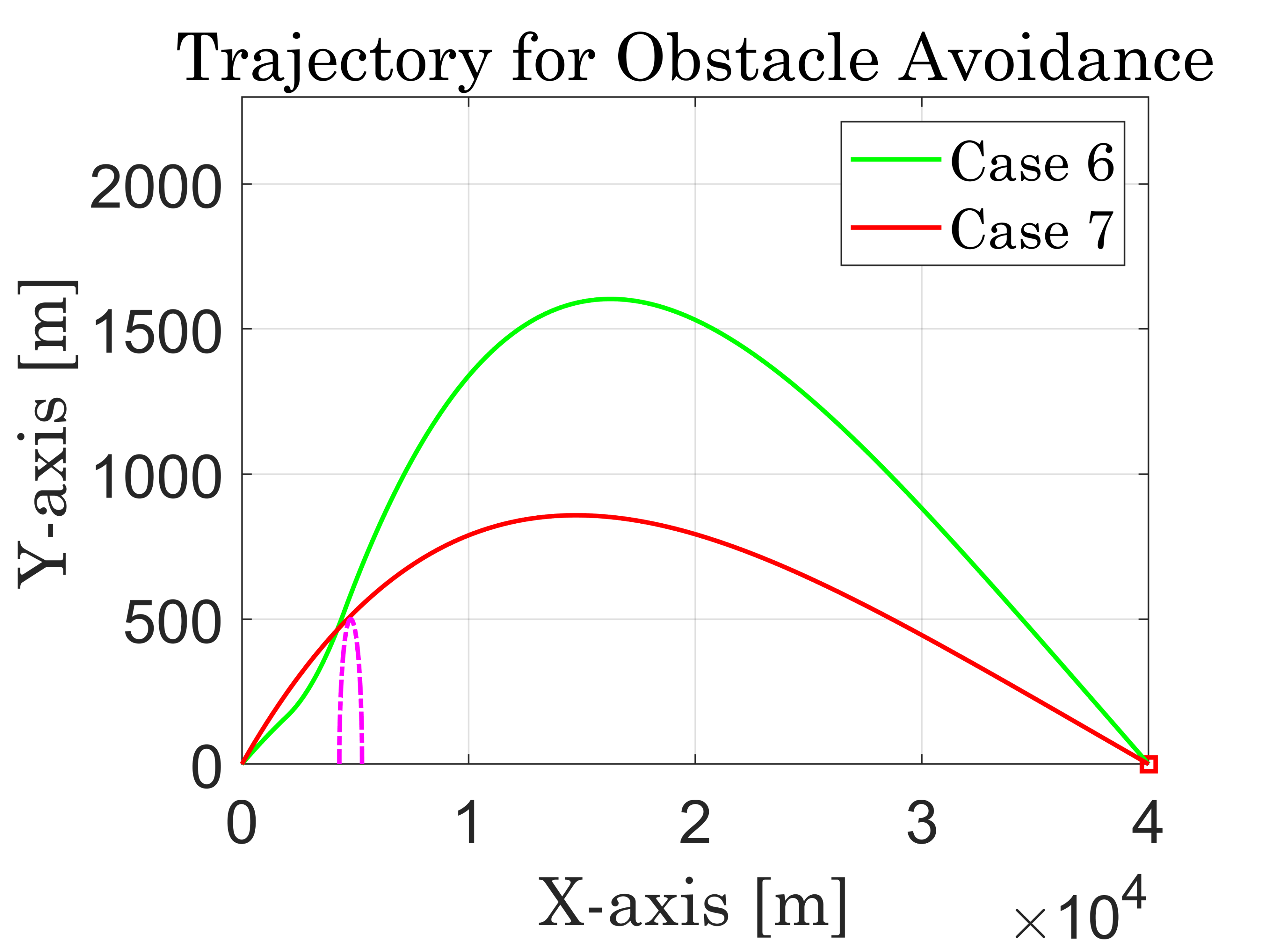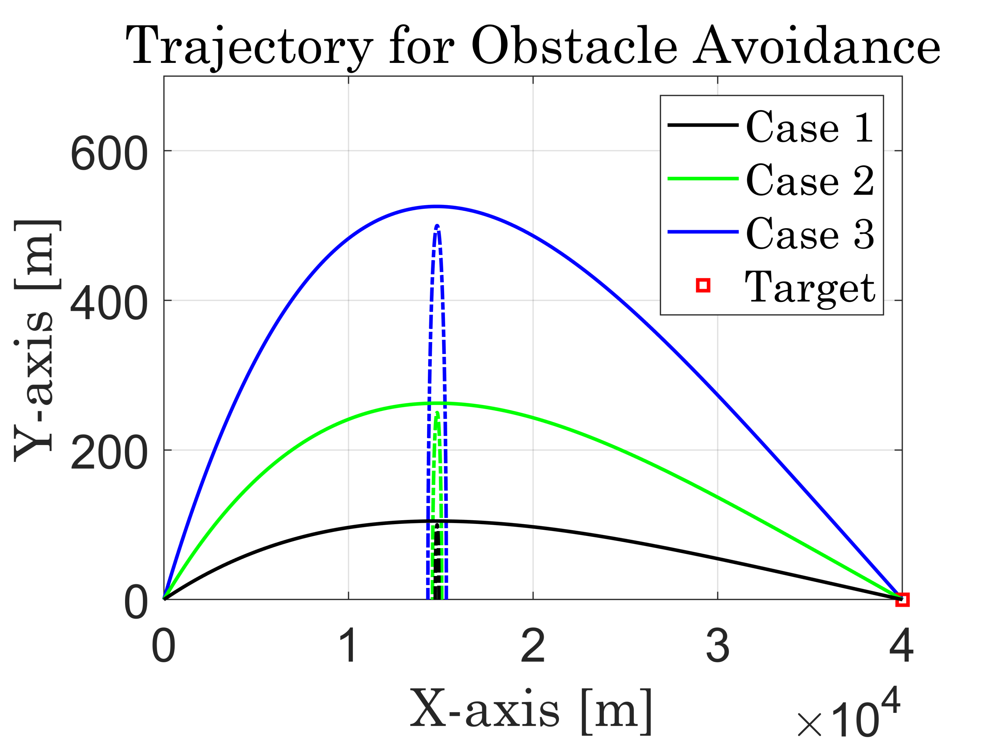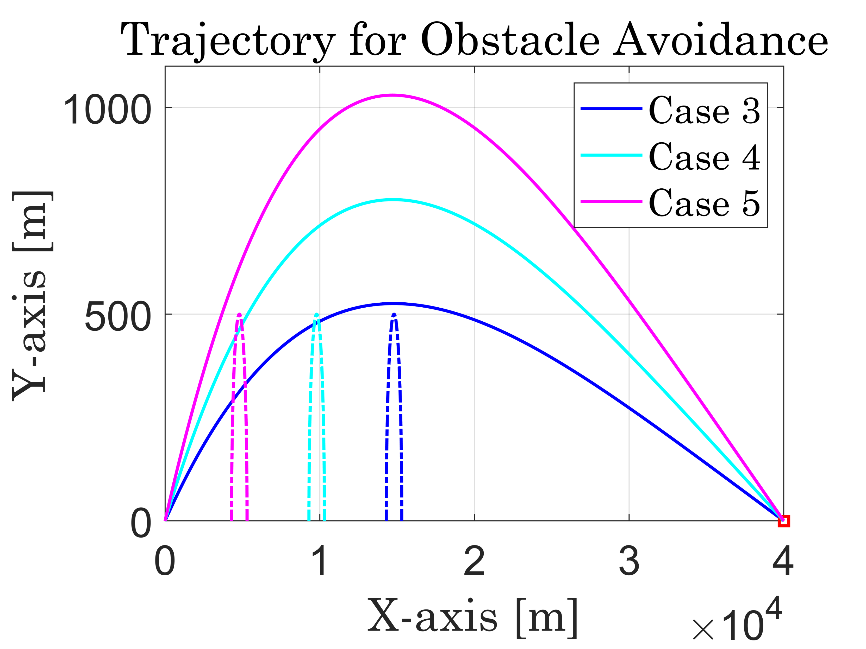 그림 5에서 Case 3의 파란색 궤적은 500m 장애물이 최대 곡면 도달 지점에 놓여 있을 때 회피하는 궤적을 나타낸 것이다. Case 4와 Case 5는