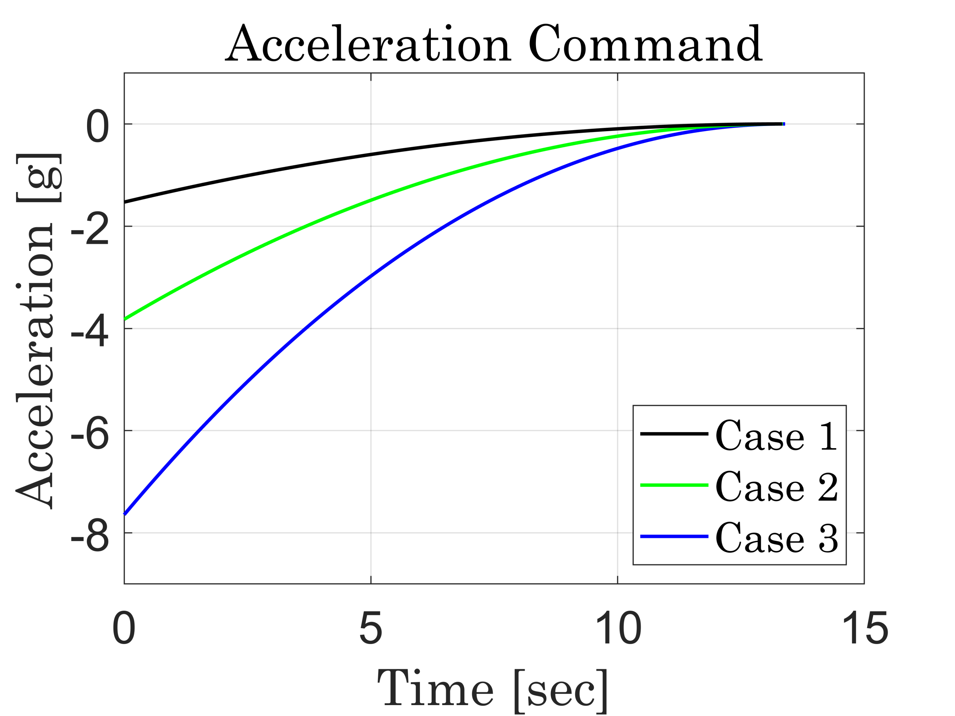 Fig. 4. Acceleration Command(Case 1: 100m, Case 2: 250m, Case 3: 500m)
