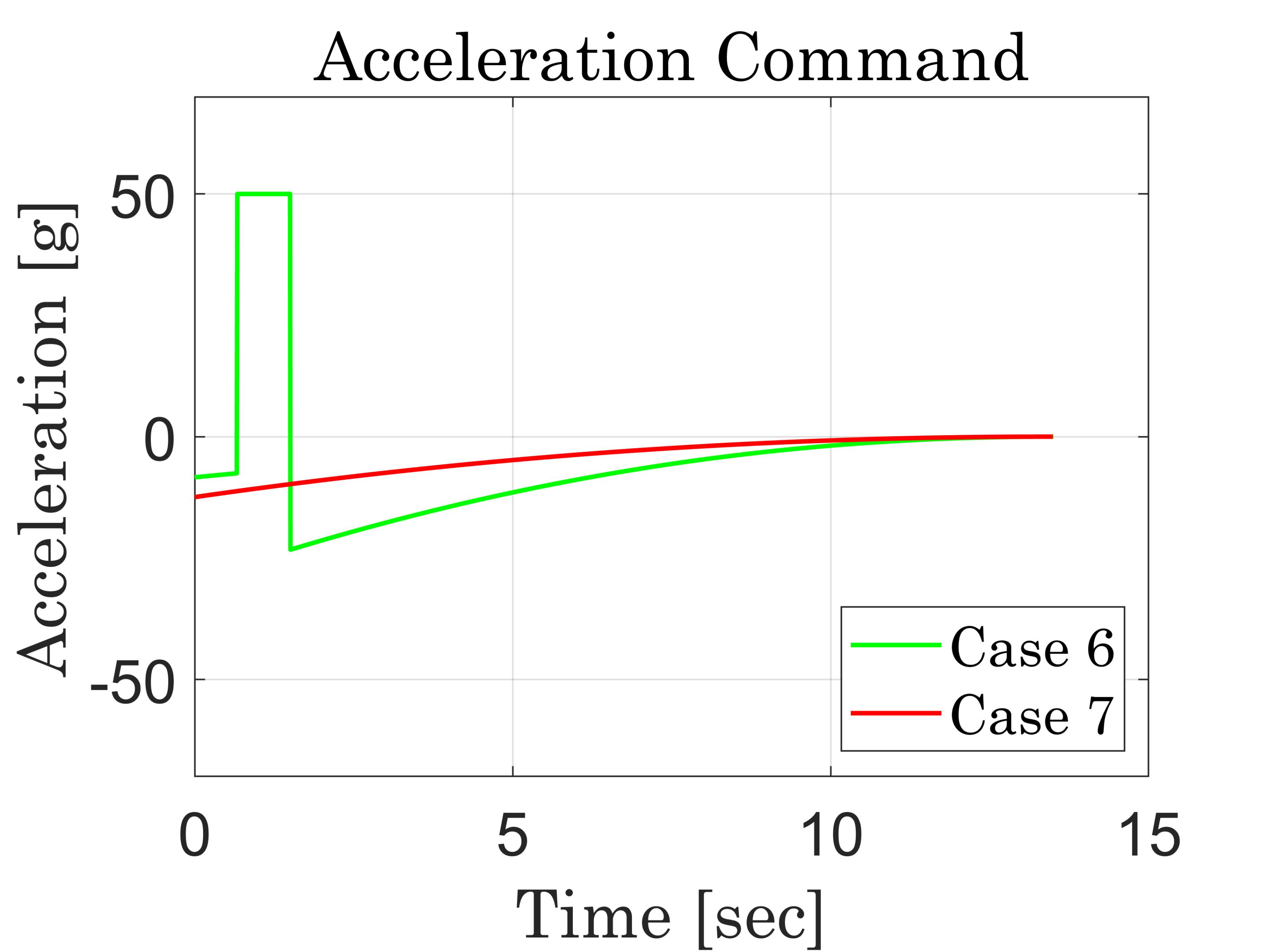 그림 9. 가속도 명령(Case 6: 참고문헌 [6], Case 7:$k=330\times 10^{-4}$)