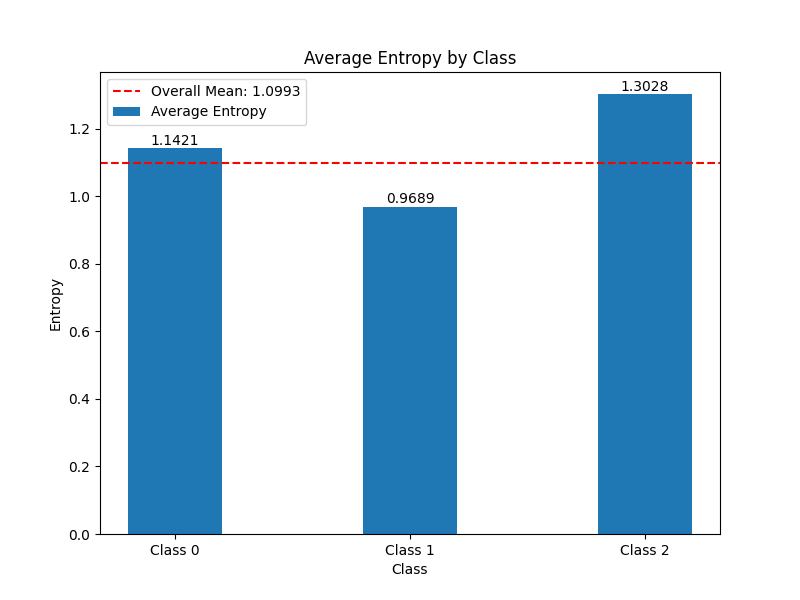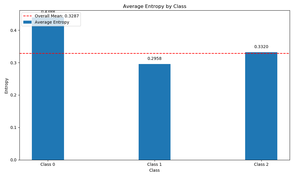 entropy of Class 0 is 0.4388, Class 1 is 0.2958, Class 2 is 0.3320, and the overall