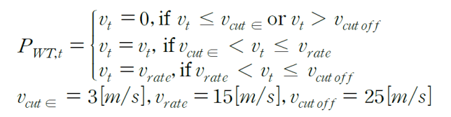 WT는 시동 풍속, 정격 풍속, 종단 풍속에 따라 결정되는 출력 곡선에 기반하여 전력을 생산한다.