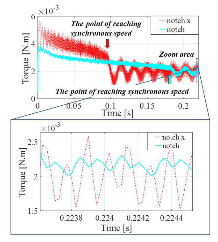 부하각을 포함한 회전자 히스테리시스 루프 면적일 것이다. 본 논문에서는 이를 확인하기 위해 회전자 노치 유무에 따른 토크 출력이 비교된다.