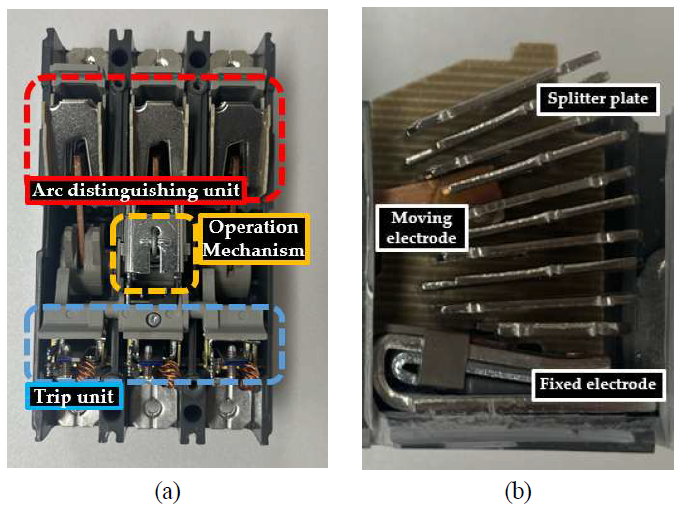 [7]. 그림 1(a)는 MCCB의 각 구성요소를 나타내며, 그림 1(b)는 아크 소호부의 내부구조이다. 차단기의 과전류 차단 동작은 전류 영점(Current-zero Point) 이전에 발생하며, 전류 영점 이후에는 아크