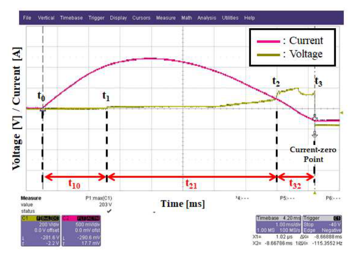 앞서 언급한 차단기의 차단 동작의 진행을 전압 파형을 통해 살펴보면 그림 3과 같이 나타난다. 차단 동작이 시작되는 과전류 감지 시점을 t0, 전극의 접점 분리를 t1이라고 하면 두 구간 사이를 t10으로 나타낼 수 있다.