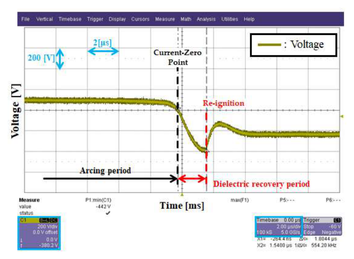 그림 4는 MCCB에서 전류 영점 이후에 회복전압이 절연회복전압보다 높아짐에 따라 소호된 아크가 다시 형성되는 재발호 발생 과정을 전압 파형으로 나타낸다.