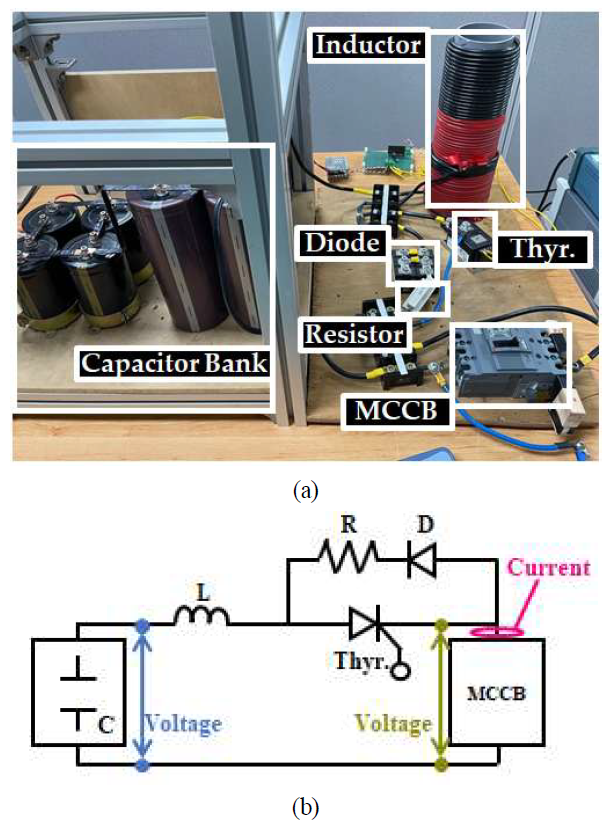 그림 5(a)는 과전류 발생시스템의 실험 구성을 나타내고, 그림 5(b)는 방전회로의 회로도를 나타낸다. 상용전원 220 [V], 60 [Hz]를 변압기를 통해 승압한 뒤, 다이오드 브리지 정류기를 통해 커패시터 뱅크