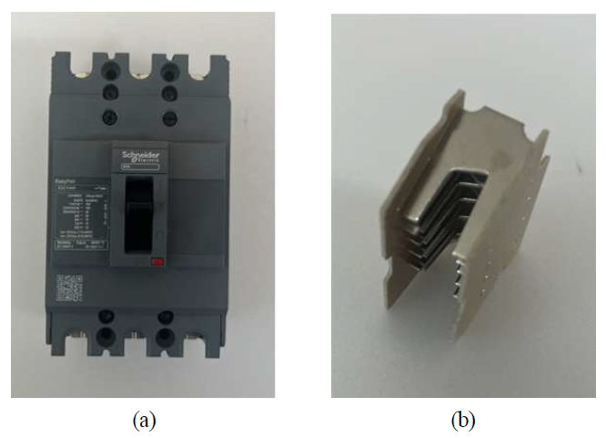 그림 6(a)는 실험에 사용된 MCCB를 나타내고, 그림 6(b)는 해당 차단기의 아크 소호부 내 Splitter plate이다.