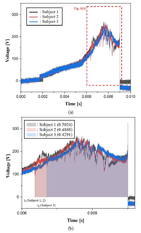 그림 7(a)의 Subject 1은 정상상태의 MCCB에 처음 과전압을 인가하였을 때 전압 파형이며, 이때 Splitter plate에서 과전류의 에너지를 소모하는데